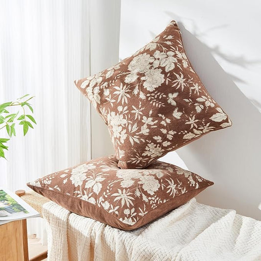 Floral Throw Pillow Covers 18x18 Set of 2,Vintage Farmhouse Cushion Covers,Patterned Jacquard Chenille Decorative Pillowcases for Sofa,Bed,Living Room Decor (Brown)