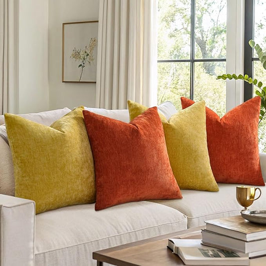 Set of 4 Throw Pillow Covers 18x18 Inch, Decorative Chenille Soft Square Couch Fall Pillow Covers, Farmhouse Neutral Cushion Covers for Sofa Bed Living Room Home Decor (Fall Rust)